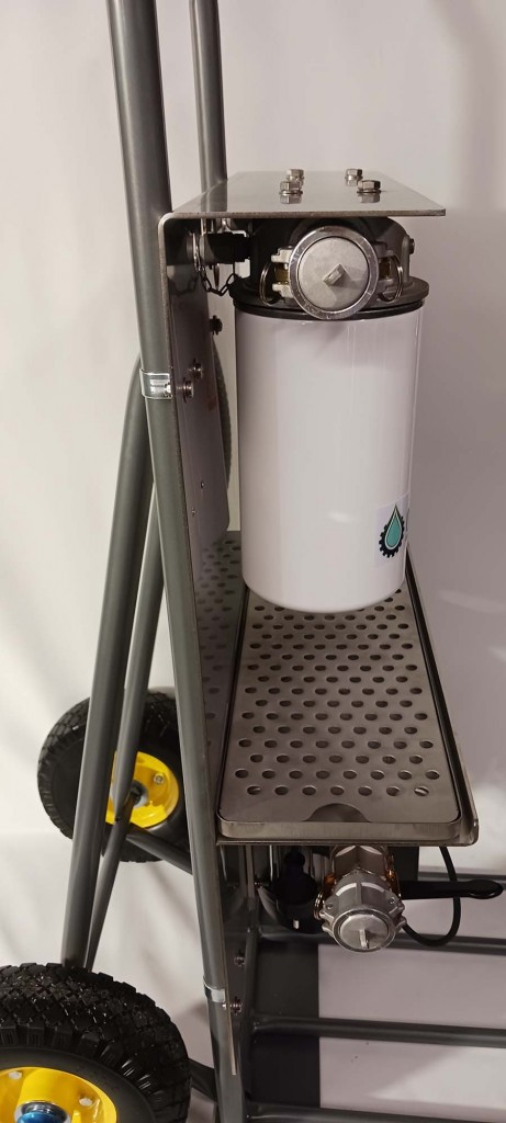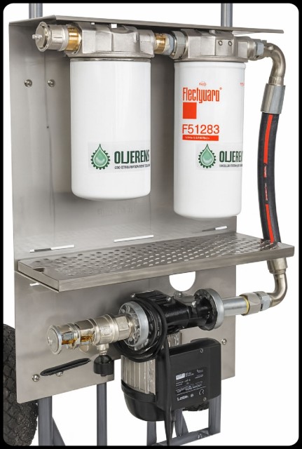 Kontrollpanelet må kjøpes utenom. Dieselrenser'n PRO 230 Volt AC. Bygget av profesjonelle tankrensere, FOR de som trenger å rense tanker. NOK45 575,00 inkl. mva. På lager: 1 stk. Kjøp Produktinfo Datablad "Rensebeistet". Dieselrenseren PRO er en kraftig, mobil filtreringsrigg med dobbel filtrering av diesel.Den benytter vannabsorberende spinn-on-filtre som er enkle å bytte når de er tette. Hele riggen er bygget på en solid sekketralle som tåler opptil 100 kg, men systemet kan enkelt demonteres og for eksempel henges på vegg eller monteres på annen tralle etter eget ønske. Fjerner vann, partikler og slam som tetter motorfiltre og skader dieselanlegg. Eliminerer dieselbakterier og mikrobiell vekst/slim – spesielt viktig i båter, anleggsmaskiner og lagertanker. Forlenger levetiden til motor, pumper og injektorer betydelig. Forbedrer forbrenningen ved å sikre ren og stabil diesel uten urenheter. Reduserer driftsstans og feilkoder forårsaket av tette filtre eller skadet drivstoffsystem. Kan brukes uten å demontere anlegget – enkel tilkobling via slanger og hurtigkoblinger. Lav driftskostnad – kun filterbytte ved behov. Modulær oppbygning – kan bygges ut eller tilpasses ulike typer tanker og maskiner. Dieselrenseren PRO er produsert i A4 syrefast stål, med skruer og dryppebrett i samme kvalitet. Den leveres med 2,5 meter sugeslange med 70 cm aluminiumsrør, samt 2,5 meter returslange. Begge rør har hurtigkoblinger (1 Cam-Lock) med sikkerhetssplinter for trygg og rask montering. PRO utgaven er modulær, og kan utvides med full analog måling av trykk/vakuum av begge filterhus. Dette gir deg full kontroll på filterstatus Digital kontrollstyring med bla. intervallkjøring er under utvikling. SPESIFIKASJONER Høyde: 120 cm (bakkenivå/håndtak på trallen) Bredde: 50 cm Vekt: 40 kg Materiale: A4 marine syrefast stål (trallen i sort stål) Sugeslange: Gjennomsiktig stålspiral oljebestandig slange, 2,5 meter Returslange: Gjennomsiktig stålspiral oljebestandig slange, 2,5 meter Første filter: Grovfilter 60 µm rustfri stålull Andre filter: Finfilter 10 µm cellulose med vannabsorberende stoff Pumpe: PIUSI 230V. Strømforbruk: 350 watt. Maks ampere: 3. Bypass-ventil: ja. Filterhus: Fleetguard (Cummings) Trykkprøvet og godkjent, Klar til bruk: ja. Hastighet: 56 ltr/minutt (3,3 m3 per time) Trallen leveres på pall, og det benyttes litt ulike leverandører på frakt. Fraktkostnader tilkommer. Dieselrenseren PRO